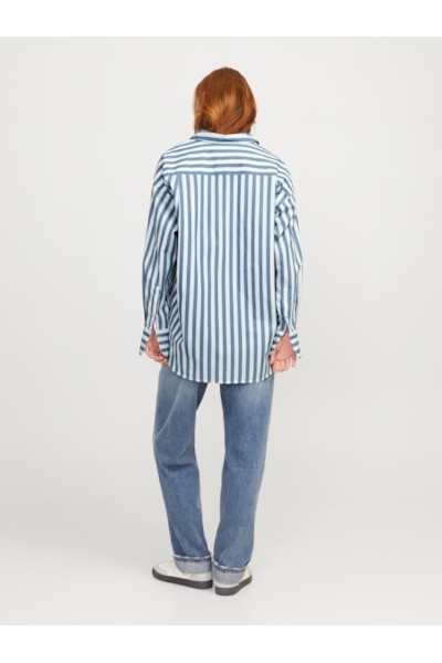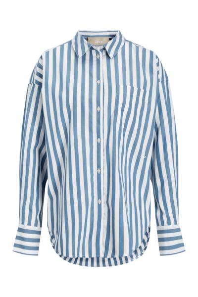 Camisa JJXX de popelín sencilla, amplia, de listas anchas, con cierre de botones, pliegues en la espalda y mangas con hombros caídos. Una camisa de calidad para el día a día, elaborada con algodón orgánico.